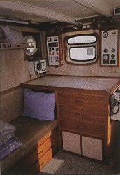 Forward of the galley is a companionway leading to the lower deck. Down there you will find the engine room and auxiliary engineering space. There's also a 10 cu. ft. freezer and a very large pantry. Forward of this, amidships, is what used to be the master stateroom. The Navy had gutted it features a breakfast bar with rour and put all its electronic gear in this